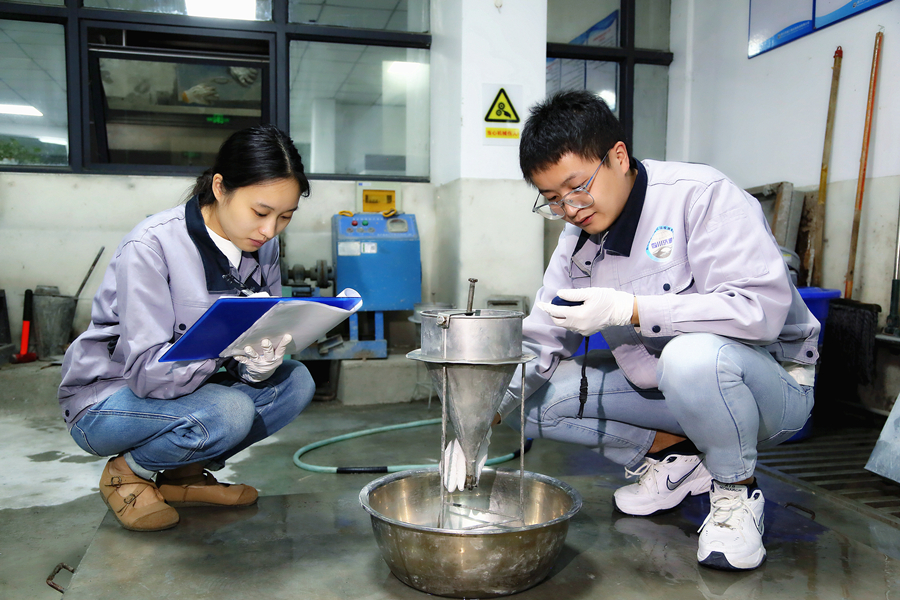 材料检测分公司检测人员在试验室进行压浆料的流动度试验